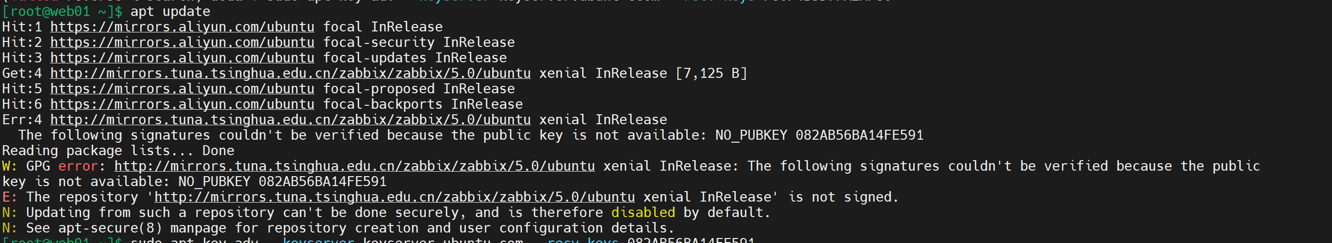 W: GPG error: http://mirrors.tuna.tsinghua.edu.cn/zabbix/zabbix/5.0/ubuntu xenial InRelease: The following signatures couldn't be verified because the publickey is not available: NO_PUBKEY 082AB56BA14FE591